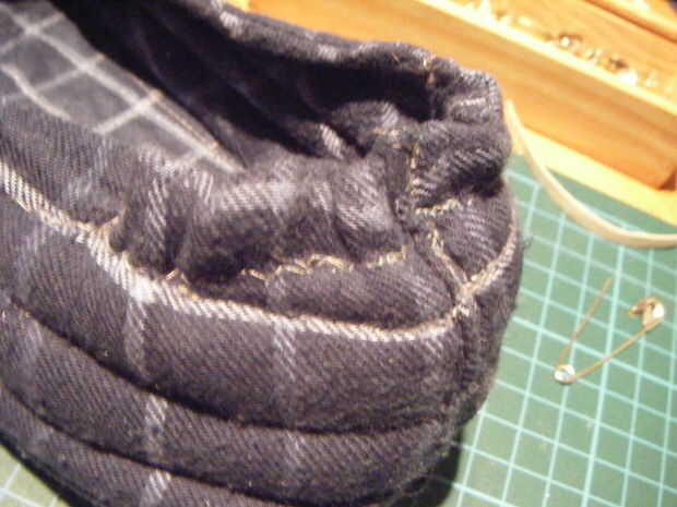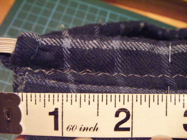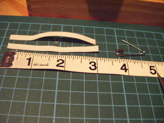 Rosca el elástico en la carcasa de 2.5 pulgadas en cualquier dirección, más el margen de costura de la parte posterior de la zapatilla, que en mi caso fue 0,5 cm en un lado de cada zapato, si olvidamos ese margen su elástica pasará desproporcionado. No necesito un pin de seguridad porque era una corta distancia para empujar el elástico y lo más importante hubiera tenido no hay manera de tomar el pasador de seguridad nuevo. Una vez tuve el elástico donde yo quería sujeta cada extremo con un alfiler, luego coser cada extremo en el lugar y coser también la parte trasera de la carcasa cerrada otra vez.