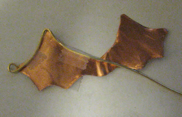 11. Coloque el bucle en festón en el borde inferior del ala, curva del empalme superior del ala (codo) al alambre, utilice alicates de punta de la cadena para doblar para anidar dentro de la articulación del ala superior de la costilla. Curva alambre hasta segunda festón en el borde inferior del ala. ajuste 1/4 pulgada de largo y rizo final.