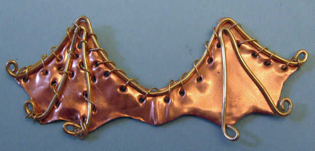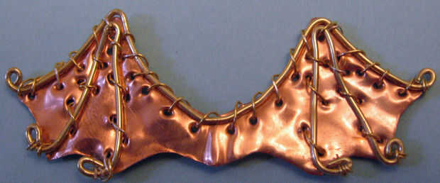 8. cable de calibre 20 en el borde superior de las alas de encaje. Hilo de alambre a través del primer agujero, alrededor del alambre de calibre 20, tire con fuerza. Tire lentamente y observe para asegurarse de no doblar el alambre - puede meter el dedo en los lazos a cerrar cuidadosamente y suavemente empuje el alambre según sea necesario para mantener un bonito lazo que aprieta cada puntada. Llega del cordón a través de cada agujero, siempre envolviendo el alambre alrededor de la parte superior de la 20 calibre de cable., a través del agujero siguiente etc. en el extremo opuesto del par ala.