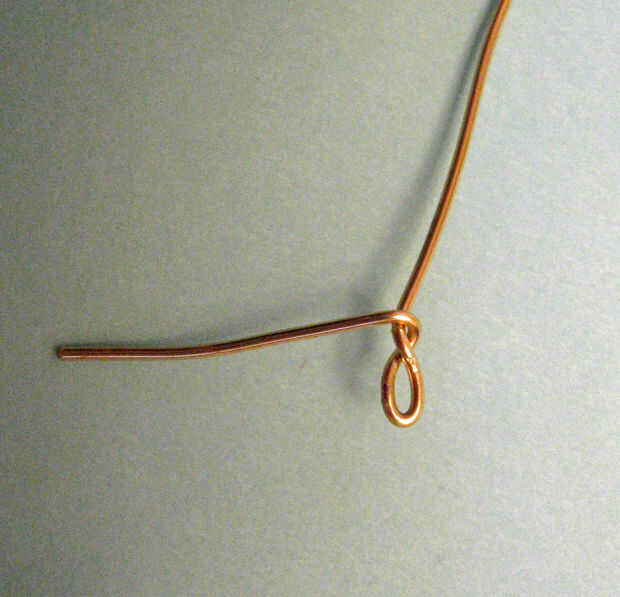 1 cable calibre inicio con aproximadamente 1 pie de 20. Con alicates de punta redonda hacen un pequeño bucle cerca de 2 pulgadas (5 cm) desde el extremo del alambre. Hacer otro pequeño bucle parallet al primer bucle. Estas son las dos orejas.