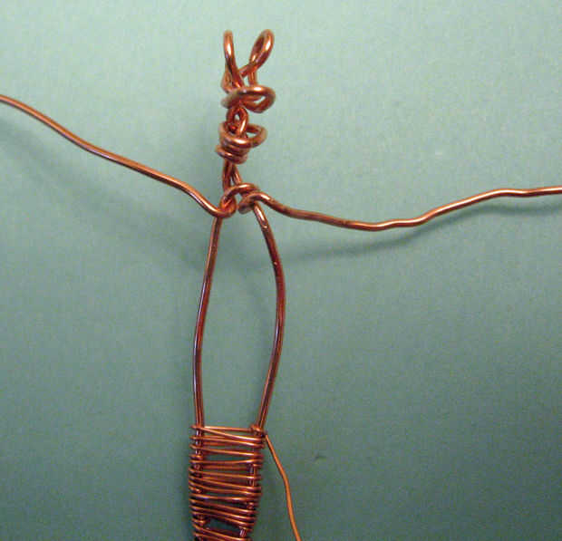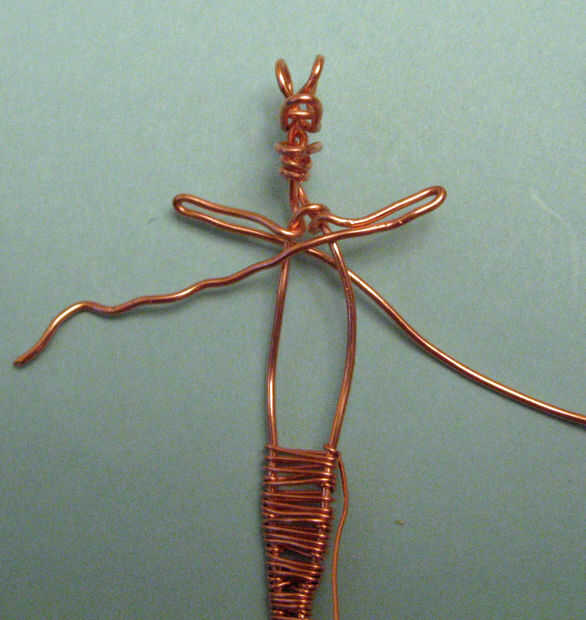 Asegúrese de que el extremo de dos gruesos de la cabeza han sido torcidas o envuelto para formar un cuello seguro. Pase los cables entre los alambres de dos cuerpo. Doble cable en direcciones opuestas, para formar una forma de t. Decidir sobre la longitud del brazo, 1/2-3/4 pulgadas es buena. Mida la longitud del brazo y bruscamente la curva el alambre con un plano o alicates de cadena. Repita para el segundo brazo. Pasar la cola de los son wirm detrás a través del cuerpo para asegurar los brazos. Dejar los extremos hacia afuera la parte posterior de bosy para sujetar las alas. Puede torcer los brazos para conseguir una textura de espiral hacia abajo de los brazos.