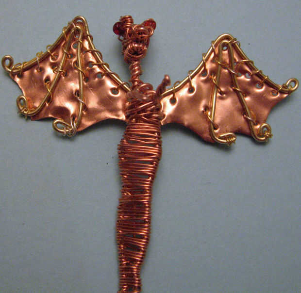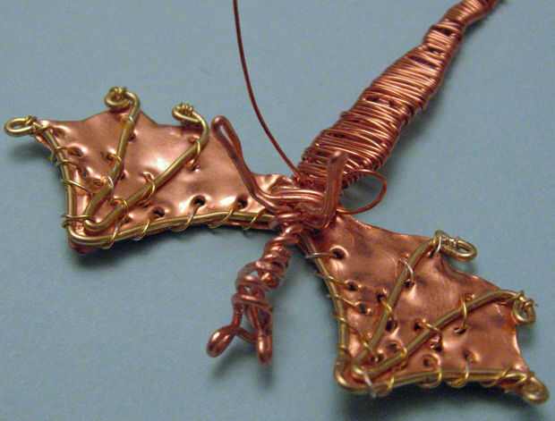 Terminar de envolver el alambre alrededor del cuerpo hasta llegar a las alas. Use alambre fino para asegurar la parte superior de las alas al cuerpo. Puede utilizar los agujeros de cordón que fije la costilla de ala, cordón a través de ellos y alrededor del cuerpo del dragón.