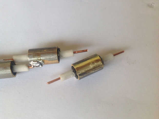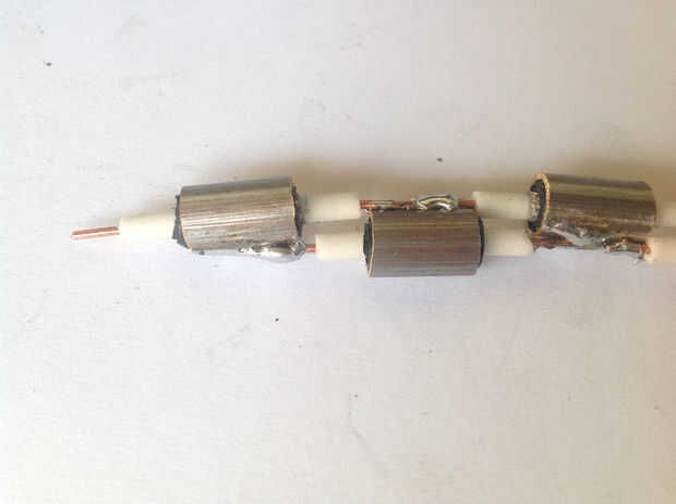 dipolo coaxial de 5GHz, antena omnidireccional. Normalmente estas antenas se hacen enteramente de coax. Mi método aunque sustituye el alambre de cobre trenzado exterior con tubos de metal cortados a la longitud de onda correcta. Este método es mucho