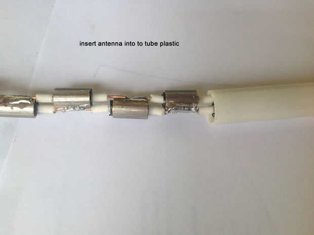dipolo coaxial de 5GHz, antena omnidireccional. Normalmente estas antenas se hacen enteramente de coax. Mi método aunque sustituye el alambre de cobre trenzado exterior con tubos de metal cortados a la longitud de onda correcta. Este método es mucho