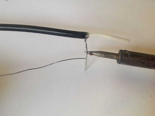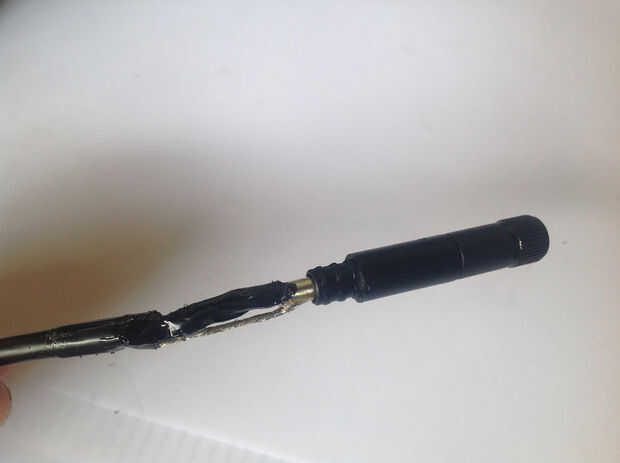 dipolo coaxial de 5GHz, antena omnidireccional. Normalmente estas antenas se hacen enteramente de coax. Mi método aunque sustituye el alambre de cobre trenzado exterior con tubos de metal cortados a la longitud de onda correcta. Este método es mucho