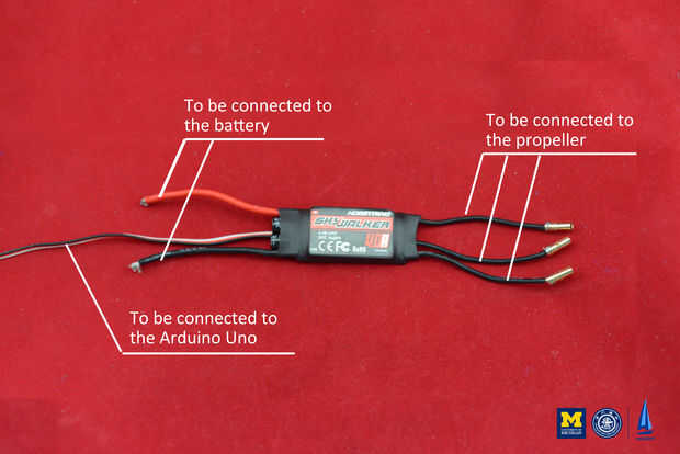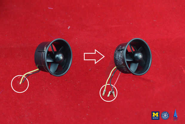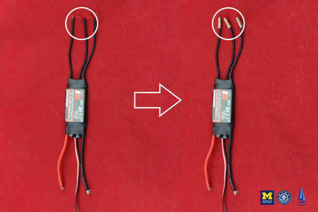 (1) soldar cada cable de un propulsor canalizado sin cepillo al conector banana macho para la conexión posterior a la ESC. (Figura 2.1)