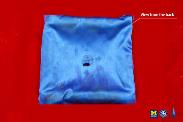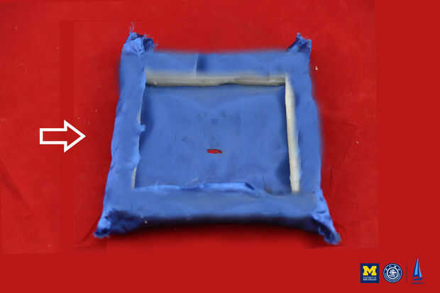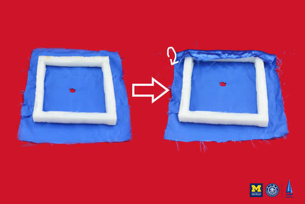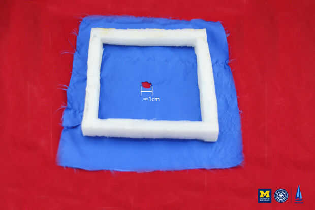(2) cortar un cuadrado de 40 cm × 40 cm con el paño de seda. Corte un agujero circular en el centro para liberar el aire durante la operación. El diámetro del agujero es de aproximadamente 1 cm. (figura 6.2)