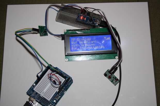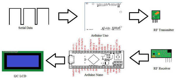 Versión 2: Después de un pedido de Ebay he tenido esta versión. Datos en serie del serie monitor o el pin RX es procesados y enviados a través del transmisor de RF en el receptor de RF. El Arduino nano obtiene los datos y si se trata de datos, lo envía a la mochila de I2C, que luego lo pone en la pantalla. (Esquema con fotos) Sólo me tomó una semana para construir el programa y documentarlo.
