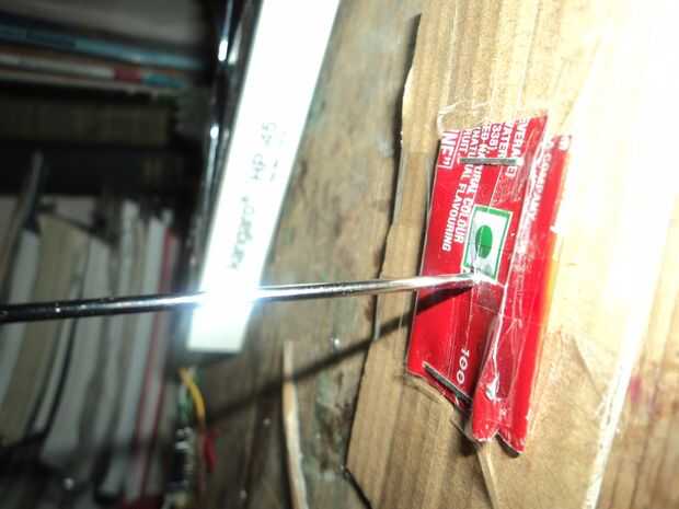 Ahora tome un pedazo de cartón cortado en piezas rectangulares y unir el joystick al cartón con una cinta para tubos. Si la soldadura había sido quitada al hacerlo es su opción para soldar otra vez o dejarlo como es porque ahora la palanca de mando tiene suficiente fuerza para estar solo y también la antena debe no ser doblada si no que el joystick no funciona correctamente.