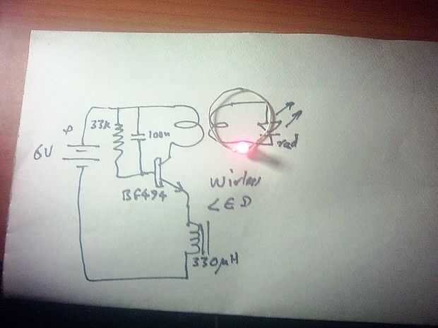 Encontré solamente rojo que LED podría activarse usando este circuito. LEDs rojo tienen el menor requisito de tensión para encender: un poco más de un año y medio voltios. Todos los LEDs tienen mucho mayor voltaje del umbral y por lo tanto pueden no funcionar con este circuito. Así que se pegan a LEDs rojos para experimentar en un principio, cuando con éxito puede encender un LED rojo que se puede probar con otros colores para ver si se puede hacer a la luz, así.