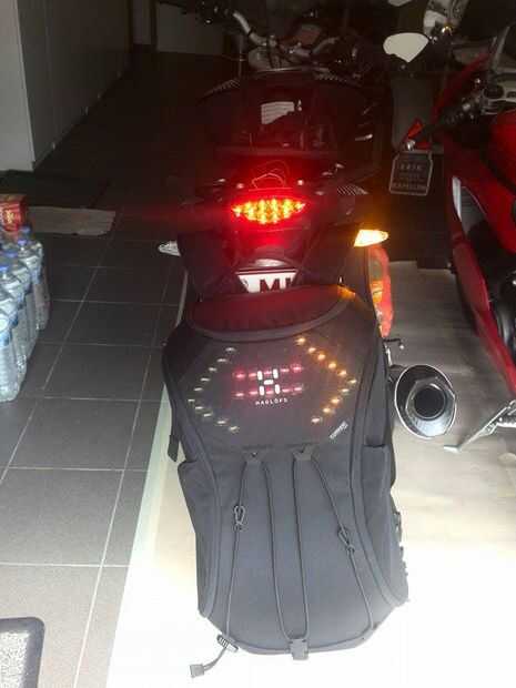 Cuando parpadea en la motocicleta, envía una señal para el arduino conectado, que a su vez envía la señal a la arduino en la mochila a través de los módulos Nrf24L01. Arduino está programado para encender los LEDs que se cosen a la mochila.