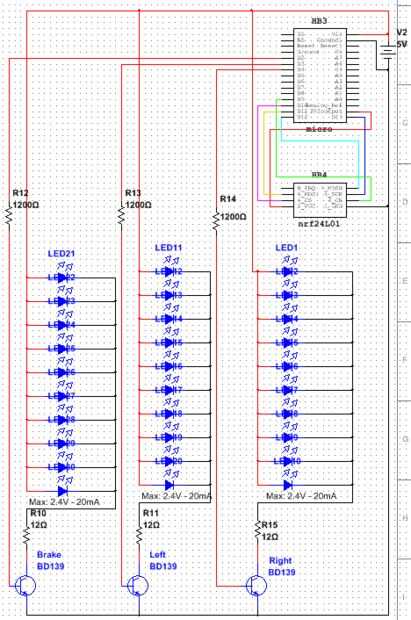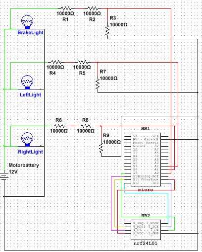 La tensión de los frenos y las luces intermitentes es entre 12-14 voltios. Una entrada analógica de la arduino debe estar bajo 5V así con un simple divisor de tensión que podemos conseguir estos valores debajo de 5V.