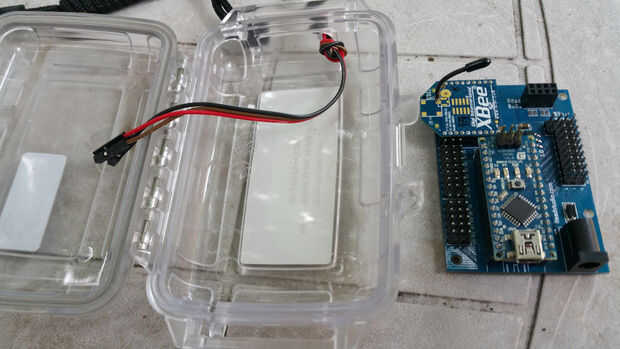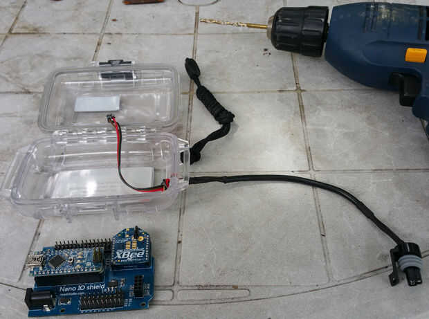 El arduino y escudo obviamente necesitan ser protegidos de los elementos. El sensor sí mismo es muy resistente y tiene un conector impermeable. Perforé 2 agujeros en lados opuestos de la otterbox, 1 para la conexión del sensor y 1 para la fuente de alimentación. Sellan los orificios con un sellador de silicona. Esto debe mantener todo seco. En este punto, el eslabón más débil sea el adaptador de CA. Tengo un tomacorriente protegido para el adaptador de CA, pero el cable no es ideal para un uso al aire libre. Planeo cambiar el alambre con algo mejor para el uso al aire libre.