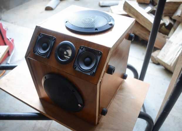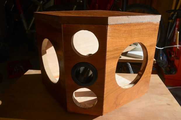 Un amigo usa una sierra de mesa (aunque podría hacerse con una sierra de calar) para cortar los principales paneles de MDF. Luego utilicé una sierra de calar para cortar los agujeros para los altavoces, amplificador y voltímetro. Añadir algunas manchas + poliuretano y estás en tu camino.