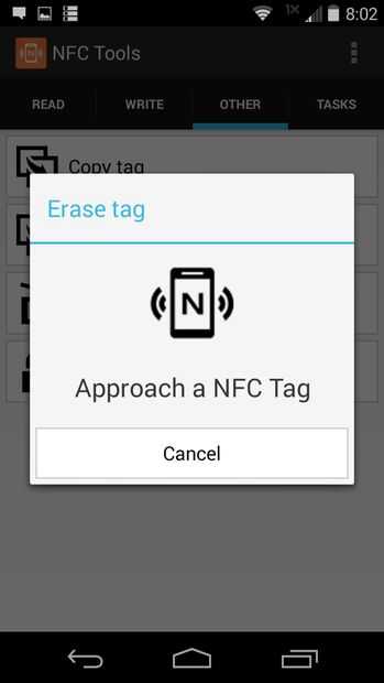 Abra la aplicación de herramientas de la tecnología NFC, seleccione "otros" seleccione "Borrar etiqueta" y colocar dispositivo android junto a la tarjeta de recompensas como se indica. La aplicación debe decir entonces "Limpie el éxito" si no es así, trate de activar Android Beam en configuración del dispositivo.