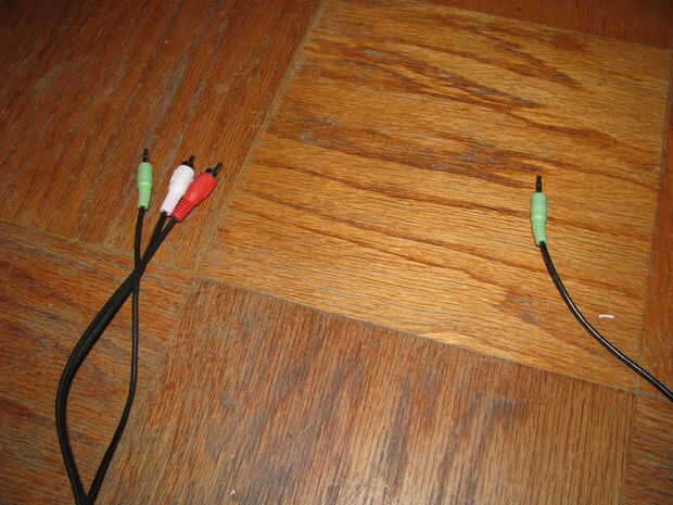 > 3,5 mm estéreo Cable auxiliar [o] los Cables rojo y blanco dependiendo de (la salida del dispositivo) y la entrada del transmisor