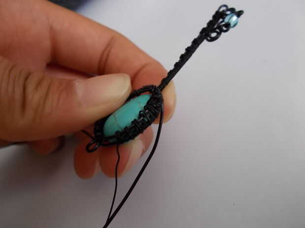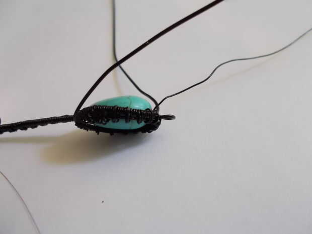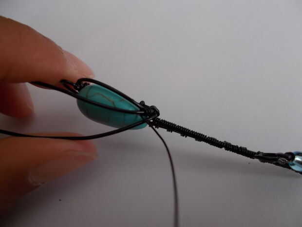 Llevar el cable en el lado izquierdo de la cuenta. Doble uno de ellos a la parte posterior del talón y el otro a la izquierda (después de otro filamento del alambre ya allí). Luego tejer los dos cables en el lado izquierdo de la cuenta, utilizando el mismo cable fino. Envolver alambre fino alrededor de ambos dos veces, entonces alrededor de sólo una tres veces, luego alrededor de ambos dos veces, luego uno tres veces, y así sucesivamente hasta que hayas llegado el bucle superior de la llave.