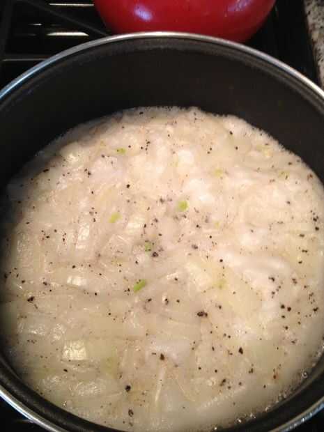 Mientras se acerca el calor, cortar la cebolla y añadir a la olla junto con el ajo, sal y pimienta. No hay mediciones. Usar la fuerza.
