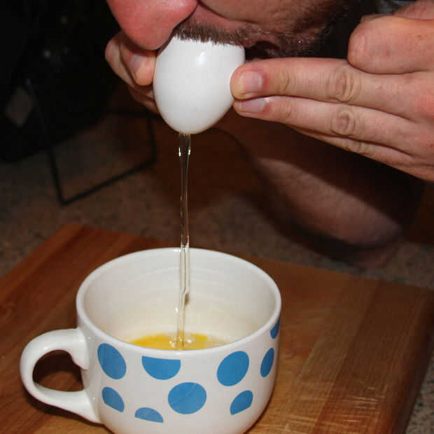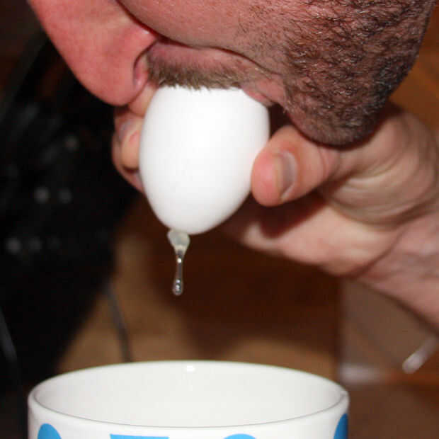 Hacer un sello alrededor de la pequeña abertura del huevo con la boca y empezar a soplar en el huevo. Tendrá algo de presión para conseguir el huevo al salir de la concha, asi que tengan paciencia. Si tienes problemas para tratar de escariar los orificios con la aguja y probar otra vez.