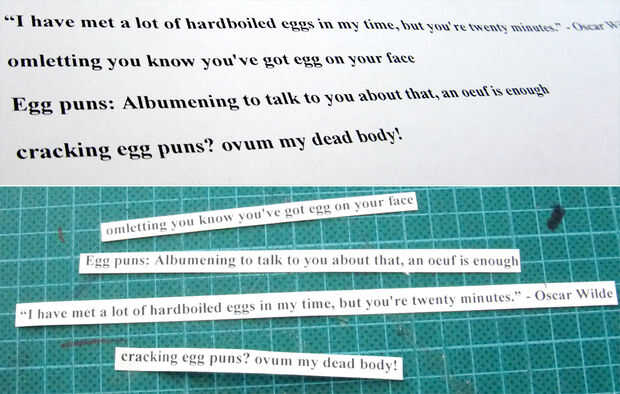 He buscado por todas partes en busca de algunos juegos de huevos únicos que no cliché: resulta, es imposible. Estoy bastante seguro de que no hay ninguna tal cosa como un juego de palabras nuevas relacionadas con huevo o eggspesssion. En mi búsqueda por internet he encontrado aún mi camino de vuelta a un tema del Foro Instructable (era golpeó #6 en Google para 'huevo juegos de palabras'!).