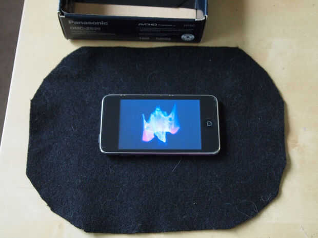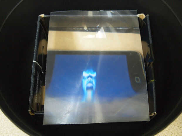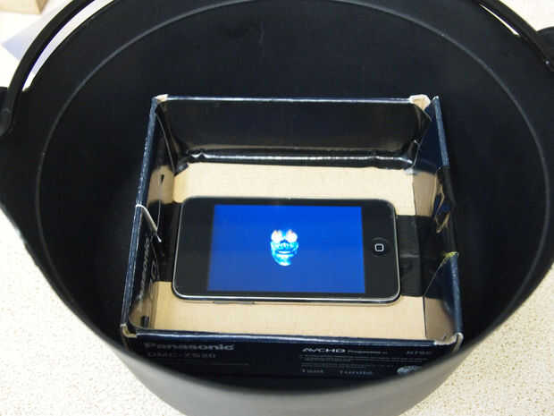 Para que funcione, el plato que usted vierte la gelatina en debe ser menor que la altura de la caldera, debe ser transparente (vidrio o plástico), tiene un fondo plano con no escribir en él (que originalmente iba a usar un plato de plástico que tenía el logo alegre y el volumen de información en relieve sobre la misma, que consigue en el camino del video). Encontré una pequeña caja de cartón que encajan el caldero y apoyar el plato de gelatina (para que el plato de gelatina se sienta más en el caldero). A continuación corté una pieza de la hoja magnética (utilizar el centro de la hoja, tiene el máximo aumento). Entonces añadí algunos fieltro negro con un orificio de corte áspero en ella para cubrir parte de la pantalla y la caja de debajo. Iniciar tu video y poner la gelatina sobre la parte superior.