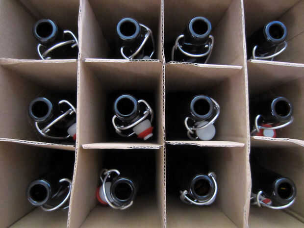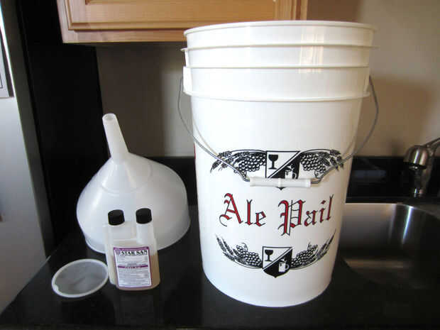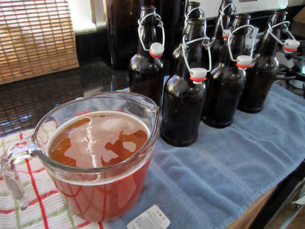 Esterilizar sus botellas, embudo y colador con Starsan. Me gusta usar botellas de cerveza de bala-top, ya que requieren menos trabajo. Como alternativa, puede usar botellas de cerveza regular y una tapadora. El embudo que utilizo tiene un filtro de complemento, que es agradable, pero no cabe absolutamente en las botellas, para que Vierta la infusión a través de embudo filtrada en una taza grande con un pico en él. Luego lo uso para llenar las botellas. Trate de hacer esta parte tan suavemente como sea posible para no soltar todo de la carbonatación de la cerveza.