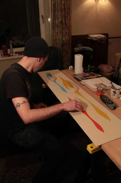 Con estas formas en lugar de pintadas pudimos trabajar a lo grande el gato y las alas deben ser. Hicimos esto por superposición de papel de calcar y dibujar las formas que más tarde sería cortar en madera refinación los dibujos hasta que fueron saciadas.