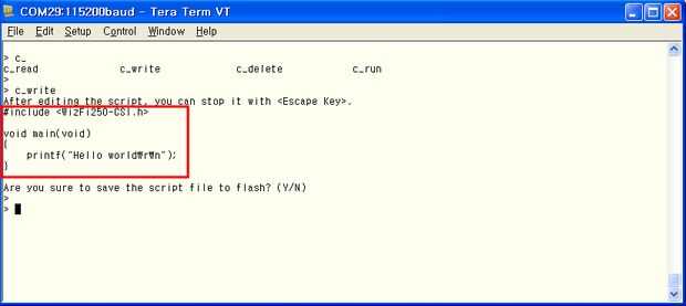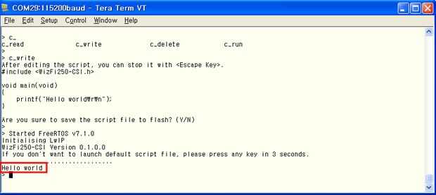 > c_write After editing the script, you can stop it with Escape Key. #include <WizFi250-CSI.h> void main(void) { printf("Hello world\r\n"); } Are you sure to save the script file to flash? (Y/N) > > Started FreeRTOS v7.1.0 Initialising LwIP WizFi250-CSI Version 0.1.0.0 If you don't want to launch default script file, please press any key in 3 seconds. .............................. Hello world >