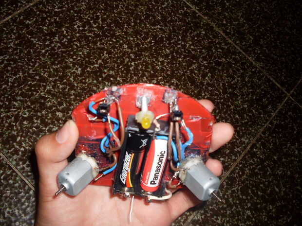 En el anverso del CD está el conductor del motor y los cables, mantenga la batería y el interruptor de encendido. Taladré agujeros en el CD de los cables, el interruptor de encendido y el perno.