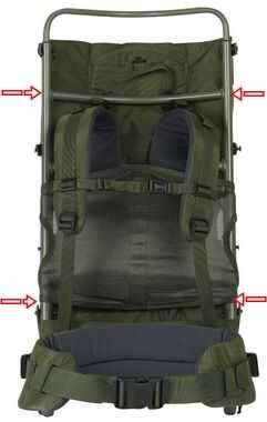 - poner trincajes alrededor del perro y el marco del recolector de memoria caché. Asegúrese de envolver por encima y por debajo de las barras transversales cerca de la parte superior e inferior del recolector de memoria caché, respectivamente (esto evita deslizamientos y aflojando mientras que montar a caballo, ver flechas rojas en la 2ª foto).