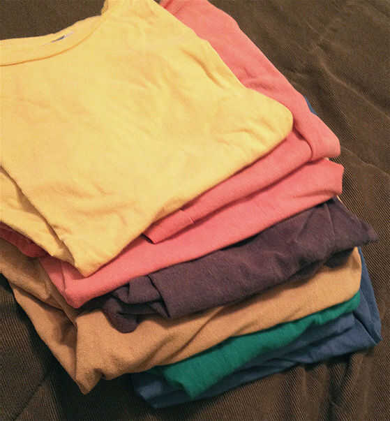 Escogido un tee apropiado de mi amplia selección de colores súper interesantes... Compré estas camisetas por mayor en línea y los colores fueron seleccionados al azar y enviados. Decidí usar algunos Rit acción de desvanecimiento de color y la luz del sol para ayudar a desvanecer y atenuar un poco los colores.