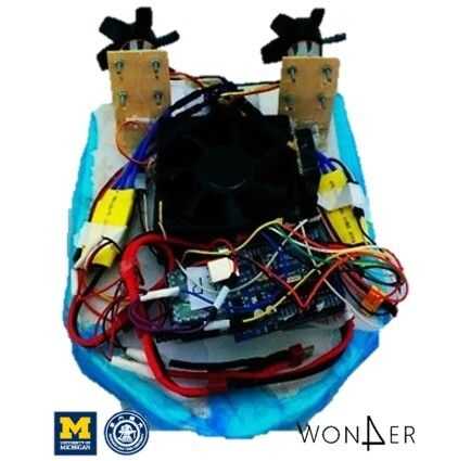 - Conecte la batería al adaptador de interfaz en forma de T. El aerodeslizador flotará encima. Controla el hovercraft con el joystick de PS2.