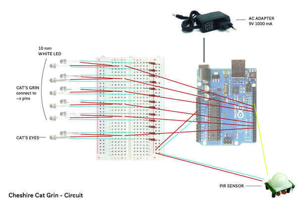 Conecte el Sensor de movimiento PIR para fijar el ojo LED al pin 4 y 12. Conecte los otros pares a pines 5,6,9,10 y 11.