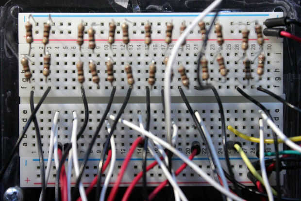 Utilice resistencias de 220 ohmios para cada LED (en realidad utilicé dos de 100 ohmios en serie, pero hizo más, mi consejo como ves).