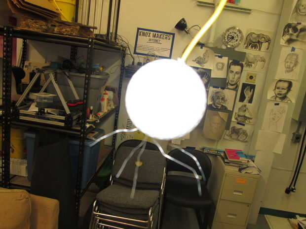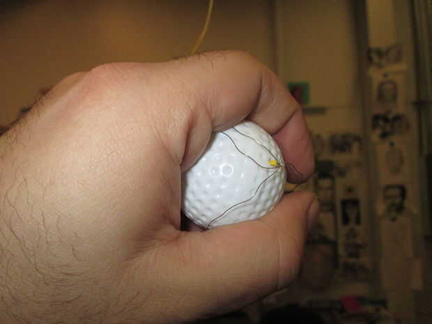Alimente el alambre a través de ambos orificios en la bola de ping pong, splay el alambre como se muestra en la imagen y envolver las hebras de alambre alrededor de la pelotita de ping pong.