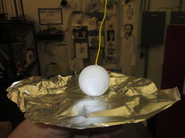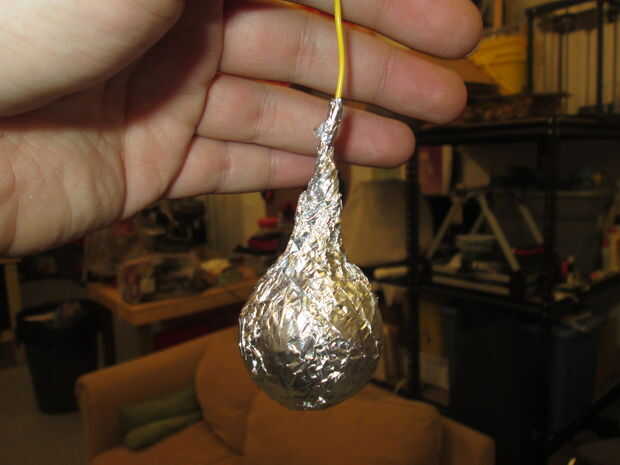 No que la bola se cablea al MaKey MaKey, colgando desde el techo y el alambre expuesto se envuelve alrededor de la bola, un poco de papel de aluminio y envolver la bola y expuestos de alambre con él.