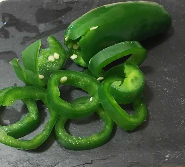 Dados sus jalapeños y champiñones. Mis trozos de Chile Jalapeño son un poco más grandes porque me encanta la contracción. Usé 3 jalapeños de tamaño medio, porque me encanta jalapeños.