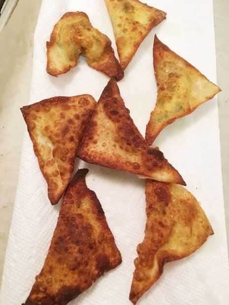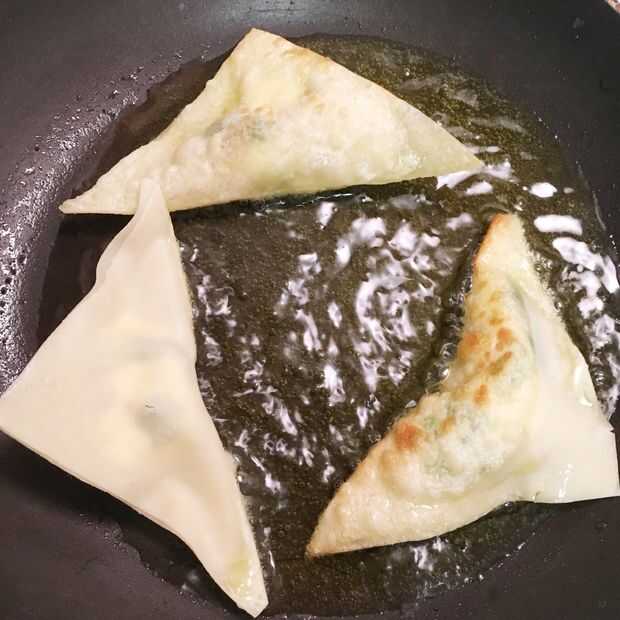 Freír los wantanes durante 30-60 segundos en cada lado para una cocción uniforme. Desea que se doren ligeramente, no oscuro dorado como en las fotos. Retire el aceite para toallas de papel así que puede drenar el exceso de aceite.