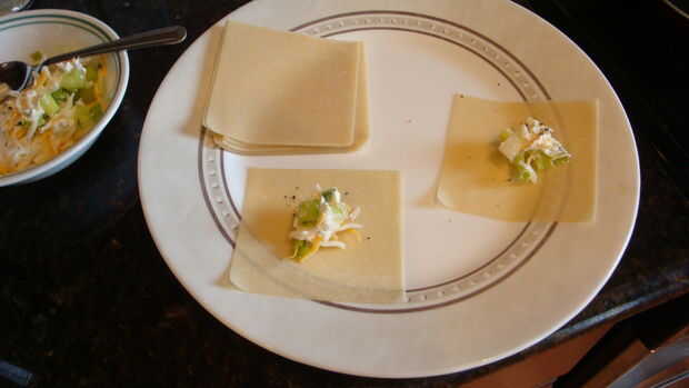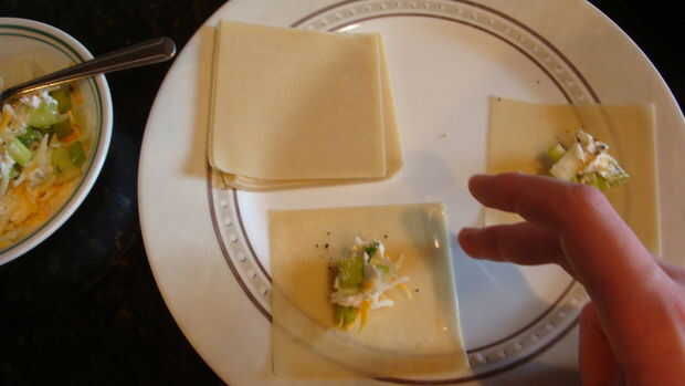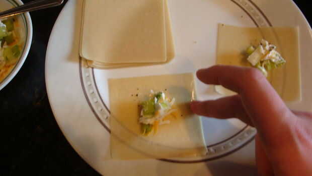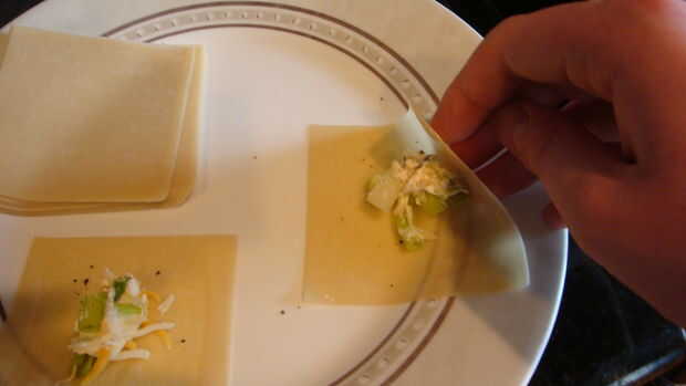 Ahora que han mezclado los ingredientes, es tiempo para envolver para arriba. Añadir una pequeña cantidad de la mezcla a la envoltura, demasiado grande y sería difícil de cerrar. Sumergir el dedo en el tazón de fuente de agua y mojar los bordes de la envoltura. Tome un extremo del contenedor y llevarlo a la otra, formando un triángulo. Humedezca los bordes de dos la parte inferior de la envoltura triangular. Empuje en el centro, unir ambos bordes, formando una forma de sombrero colonial de Napoleón. Junte los dos bordes.