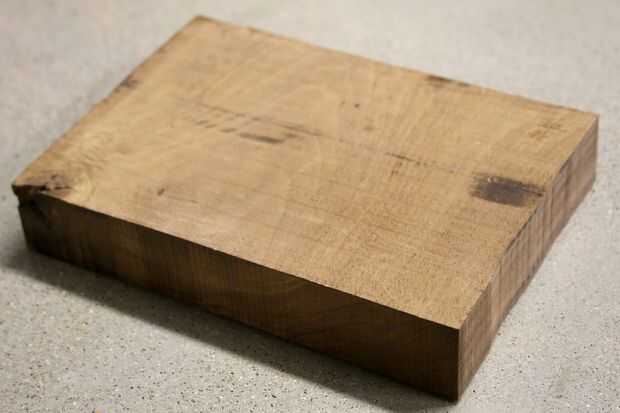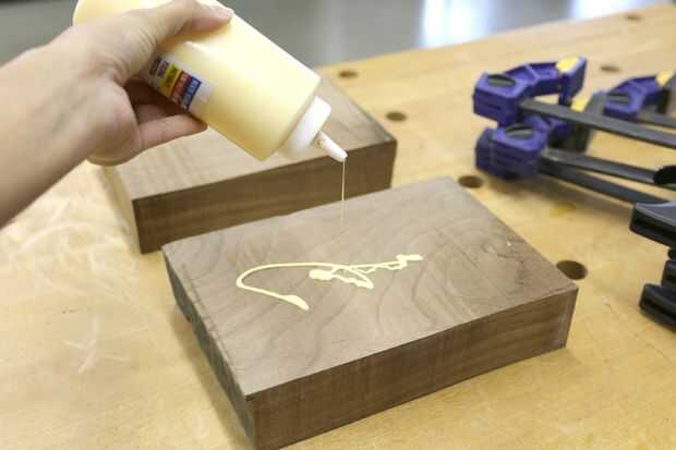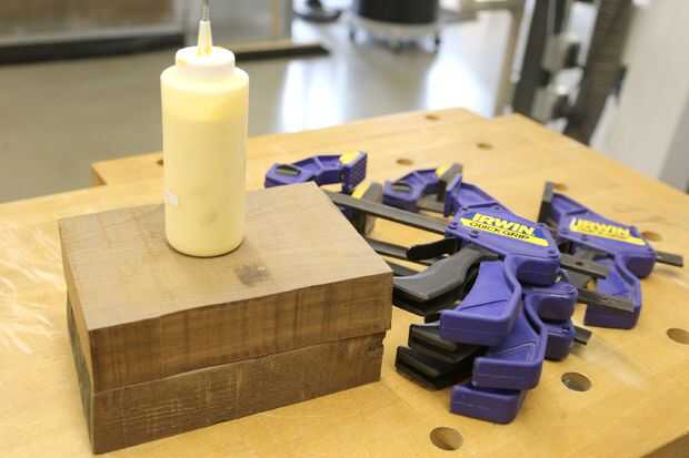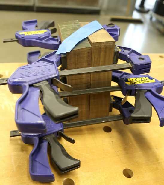 Así que tomé todo y cortar por la mitad en una sierra de cinta. Luego pegan ambas piezas, usando puños para asegurar la retención. Ha permitido establecer durante la noche. Lo hice porque quería una plaza casi en forma de producto final, y el pedazo original de nuez no era lo suficientemente espeso para mi gusto.