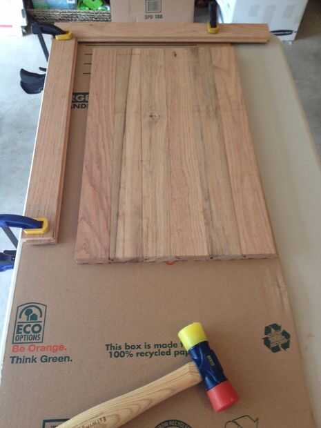 A continuación, pegan las tablas individuales en el último paso junto a la frontera interior. Lo que he encontrado funcionan bien para este paso es ajustar el tablero en el borde exterior del panel y pegar con éxito cada junta para, manteniendo sus bordes, al menos por un lado, recta. Para ayudar con esto, otra pieza de madera de desecho puede ser afianzado con abrazadera y el extremo de cada tabla se mantiene al ras para. Además, para asegurarse de que cada empalme de ranura y lengüeta está bien equipado, un caucho o un martillo de plástico puede utilizarse para golpee ligeramente en las juntas. Una vez que todas las juntas han sido pegan juntos (seis tableros en mi caso), se puede pegar la tira de la frontera interior hasta el final.