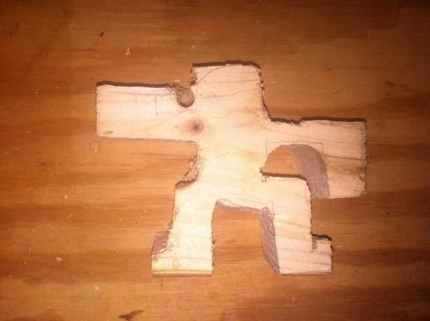 Ahora tomé el rompecabezas y poner el bloque de madera en mi vice grip. Apliqué mi protección para los ojos y luego cortar mi forma. Usé el taladro y brocas para perforar algunos agujeros donde no pude conseguir bastante mi rompecabezas para llegar a.
