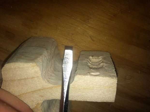 Después de lijar el cuerpo para ponerse en forma se puede empezar a marcar el brazo que la tapa de plástico. Una vez que se marca tomé un flathead destornillador y empujado en la madera para comenzar a sacar trozos. La madera que estoy usando es muy suave por lo que variará. Puede utilizar la herramienta Dremel con una broca pequeña para esta parte así.