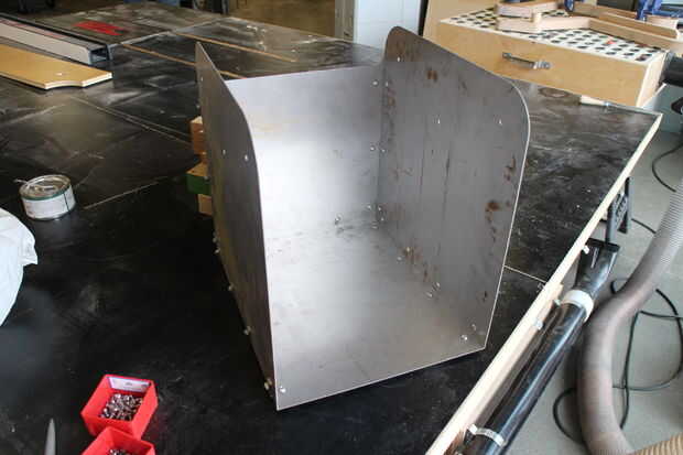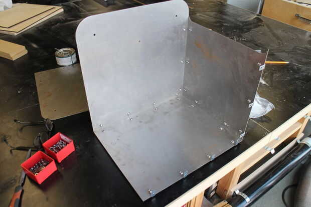 Después de presentar a los bordes de las piezas de metal, comencé apernado de las piezas juntas. Las plantillas del cubo de fuego se establecen de 1 "X 1"abrazaderas de las esquinas, por lo que con los tornillos que menciono en las herramientas y materiales de paso, todo encaja muy rápido. El cubo es abierto en la parte delantera y tiene agujeros adicionales para unir a la madera mediante separadores.