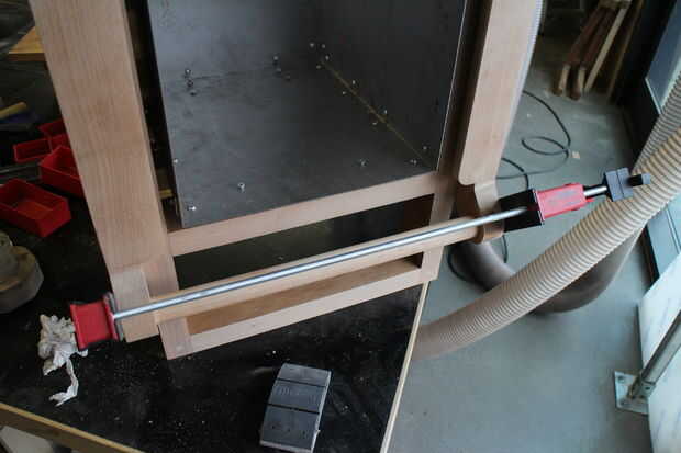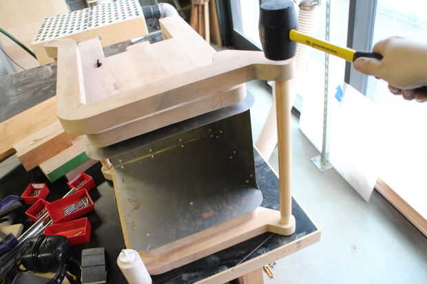 Colocación de un brazo con el mango unido a su lado, pegado los orificios, colocados en la chimenea y martilló todo junto con un mazo de goma. Dejarlo durante la noche se sientan con las abrazaderas en los mangos para ir