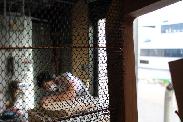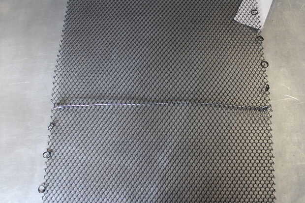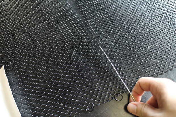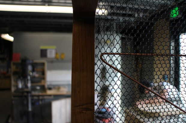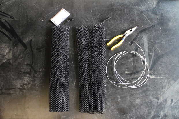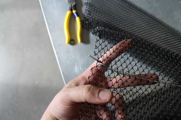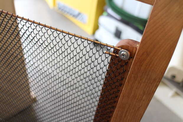 Para conectar las dos cortinas, yo solo rosca algún cable por el extremo abierto de cada lado. Comencé con afianzar el alambre, pero terminé usando varillas de soldadura-son lo suficientemente rígidos para mantener la pantalla de la caída en el centro.