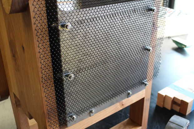 Yo entonces envuelto la pantalla en la parte superior del hoyo. En este punto me di cuenta de que sólo podía utilizar los tornillos existentes en el cubo de fuego para fijar la pantalla en la espalda, así que estalló algunos pernos largos de 1/2" y añade una arandela. Es importante usar dos tuercas para esto-la primera tuerca mantiene la caja firmemente sujetada, la segunda tuerca con la arandela solo tiene la pantalla. Usted tiene que asegurarse de que el cubo es seguro, ya que el calor, sin duda, la deformación.