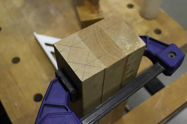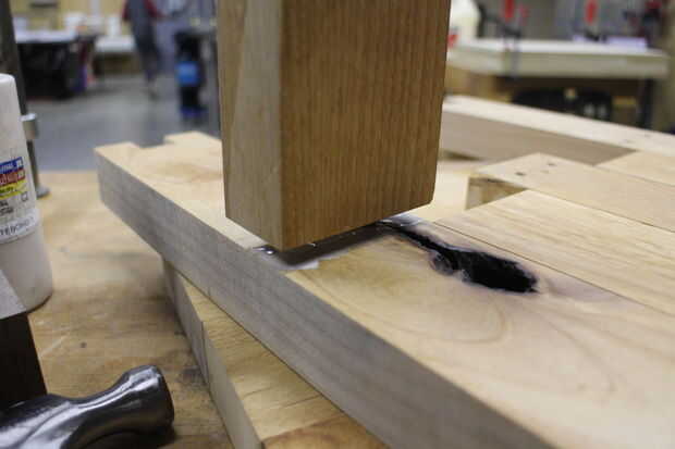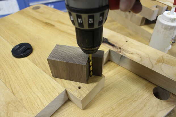 Puesto que ya estaba usando los, fui con unirse a clavijas para conectar los elementos de la plataforma a los paneles de madera. Esto debería funcionar en teoría, pero el problema es que cada tabla tiene 2 pasadores en cada extremo. Significa que hay 12 agujeros separados para alinear entre 3 tablas separadas. He encontrado esto es prácticamente imposible, por lo que terminó una clavija de cada mesa de corte por lo que sólo había 3 agujeros que necesitaba para alinear a la vez.