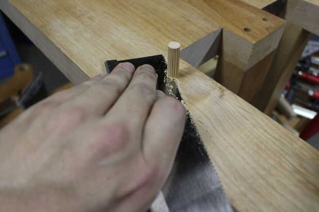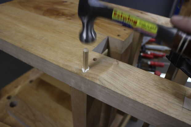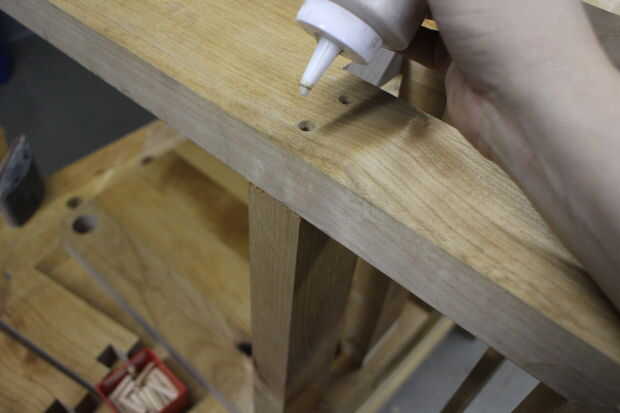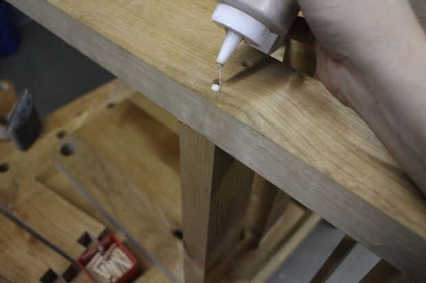 Una vez tienes los tornillos (apretándolos en pedazos afianzada con abrazadera, pegados), añadir una gota de pegamento y martillo en las clavijas de Unión.