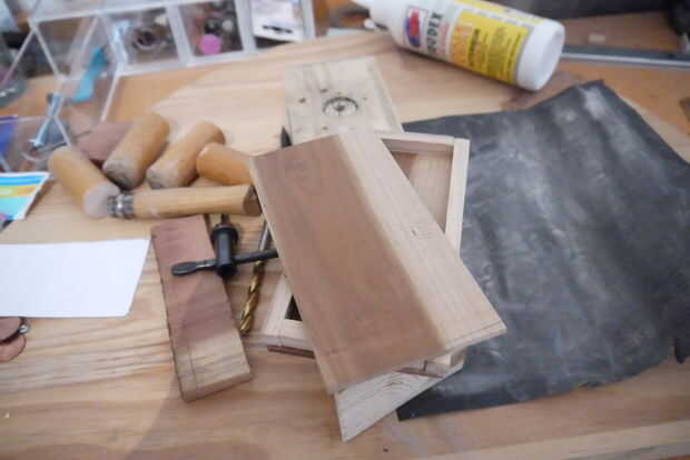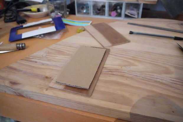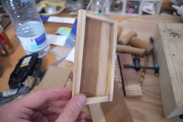 Luego cortar los lados (0,75 cm de ancho) de la madera más gruesa, asegúrese de que es más gruesa (superior) a su teléfono. No demasiado porque tendrás que lijar más adelante, pero necesitarás un poco de un margen (1 mm). Organizar firmemente alrededor de su teléfono o plantilla y pegar en el lugar en el interior del panel que eligió para el reverso de la caja. Hacer una bonita plaza cabe.